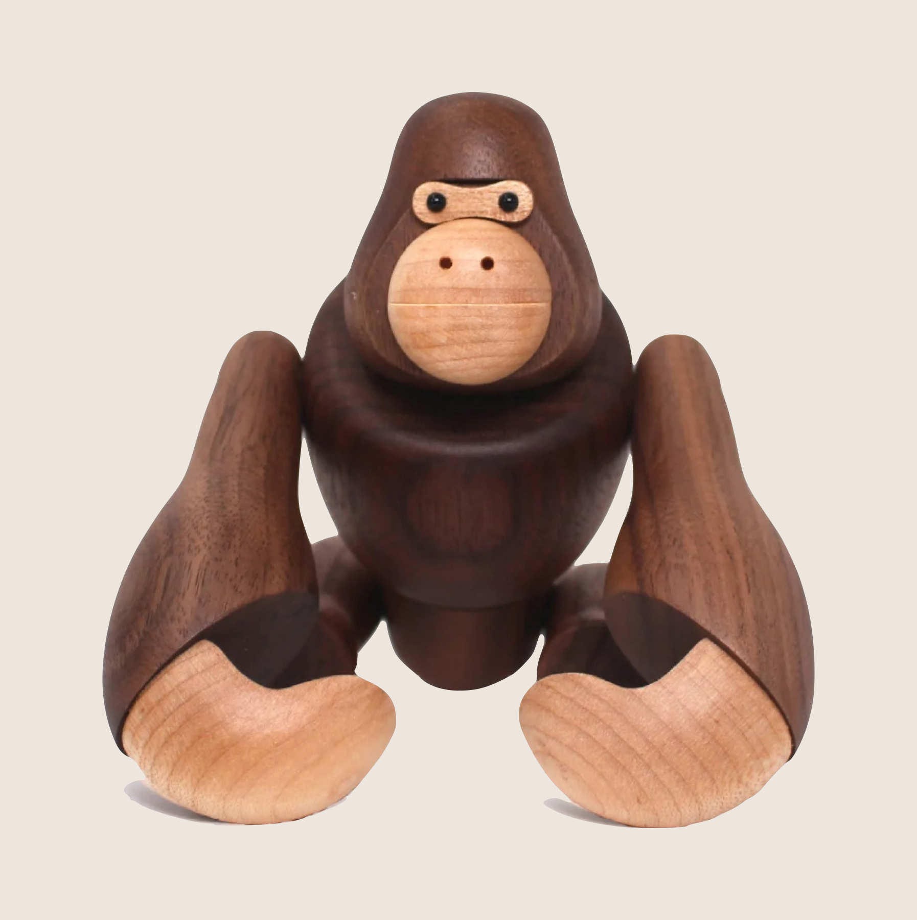 A wooden gorilla figure with adjustable limbs, allowing for dynamic poses and playful decoration.
